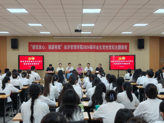 为落实学校关于2024届毕业生党员教育工作安排,抓实做细党员教育管理工作,引导激励毕业生党员牢记使命担当、强化党性修养、赓续“德院精神”,6月19日,经济管理学院举办“请党放心 强国有我”毕业生党性党纪学习教育暨老党员重温入党誓词、新接收预备党员入党宣誓仪式。学院党委班子、学生党支部书记、全体毕业生党员和2024年上半年新发展预备党员参加了此次活动。