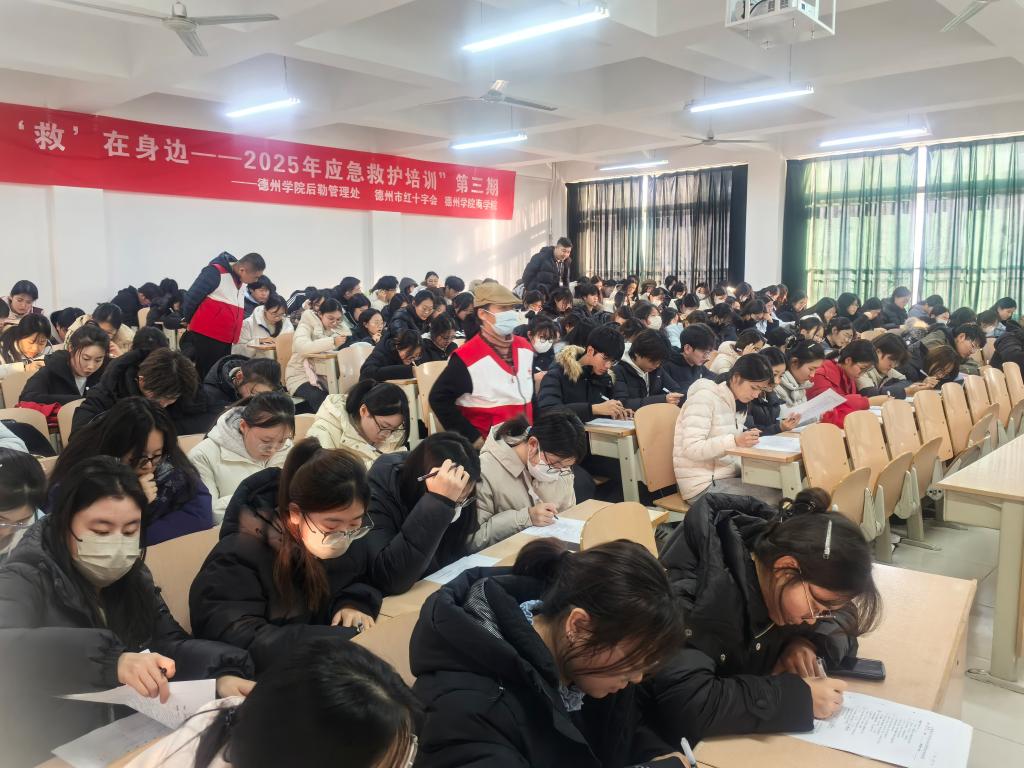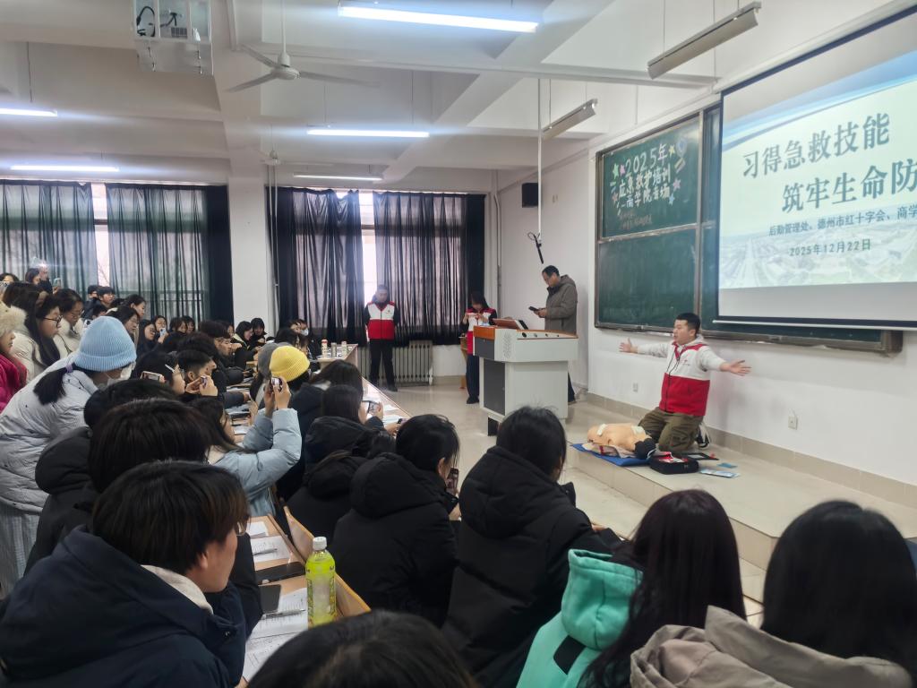 为深入贯彻落实校园安全工作要求,厚植师生生命安全防护理念,提升学生应急救护实操能力,构建平安校园立体化防护体系,德州市红十字会、beat365唯一官方网站后勤管理处医务中心、beat365唯一官方网站于工科教学楼2014教室共同开展“守护生命 ‘救’在身边”应急救护培训活动。本次培训吸引200余名学生踊跃参与,现场学习氛围浓厚。