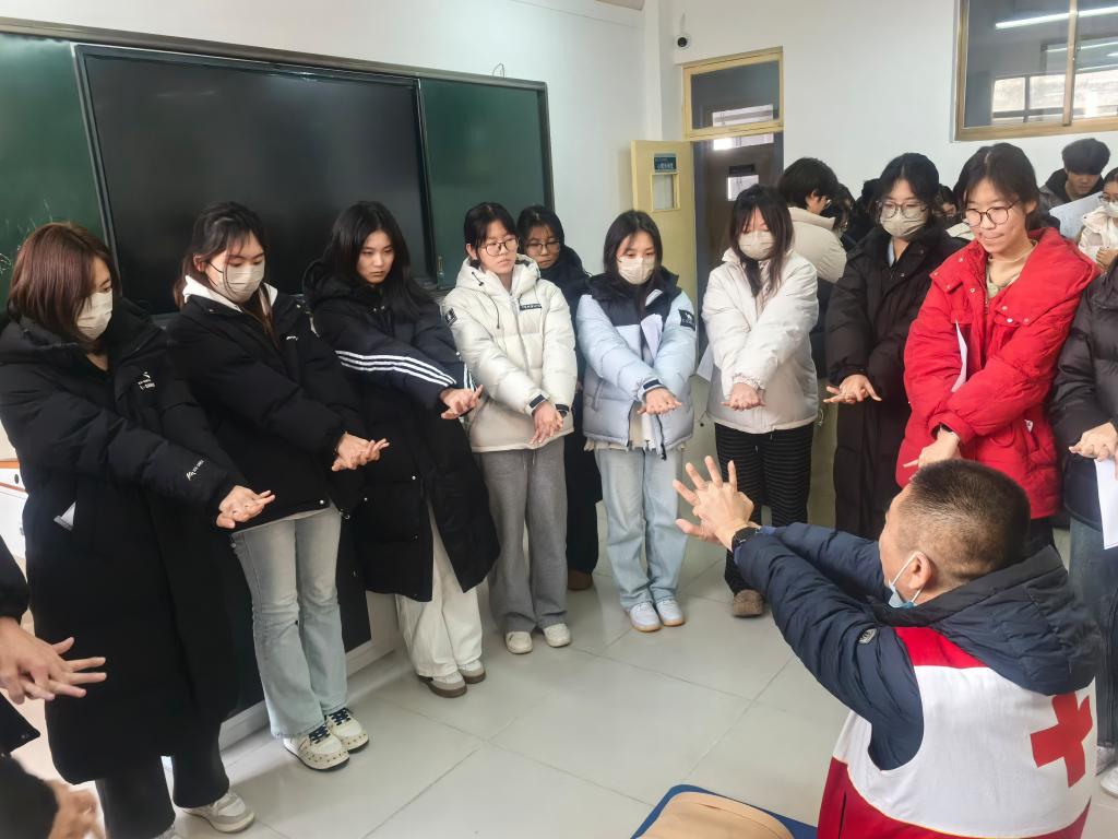 本次培训特邀德州市红十字会应急救护培训中心国家级应急救护培训师、德州市蓝天救援队队长杨岸瑛老师主讲。培训伊始,杨岸瑛老师围绕应急救护核心原则、心肺复苏(CPR)操作流程及自动体外除颤器(AED)使用规范等关键内容,进行了系统细致的理论讲解,结合真实应急案例,生动阐释了应急救护“黄金四分钟”的重要性,让在场学生对急救知识有了全面认知。