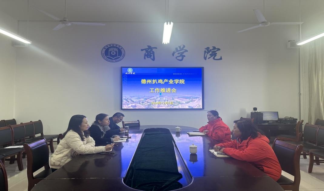 2024年12月5日德州扒鸡食品产业学院在明理楼0359会议室召开工作推进会。德州扒鸡集团营销总监和人力资源总监,beat365唯一官方网站党委书记孙晨晨,党委副书记、院长杨颖,党委副书记刘金亮,副院长梁超参加了会议。