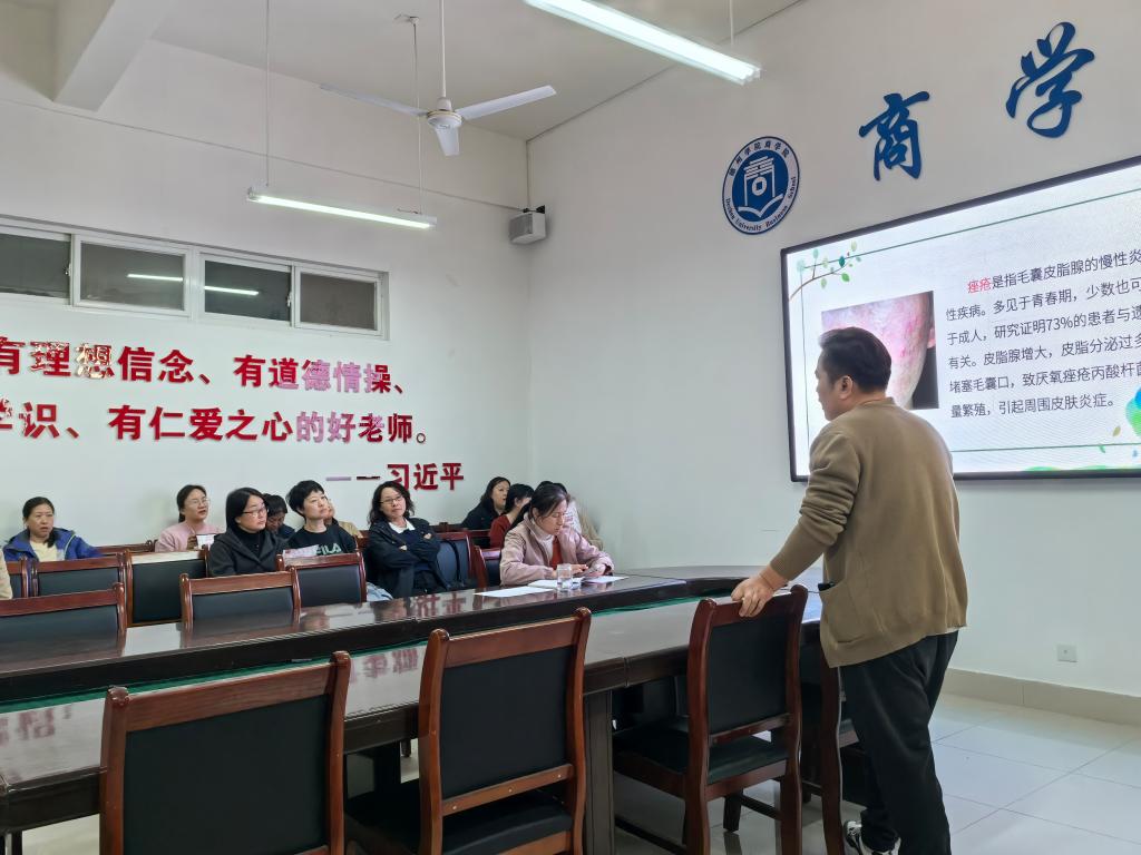 为增强教职工健康管理意识,普及科学护肤知识,3月25日,beat365唯一官方网站特邀德州市中医院医学美容中心主任、主诊医师王玉栋走进校园,为全体教师开展了一场题为“科学护肤,健康同行”的专题讲座。活动旨在通过专业医学知识科普,帮助教职工树立正确护肤理念,以更佳饱满的状态投入教育教学工作。
