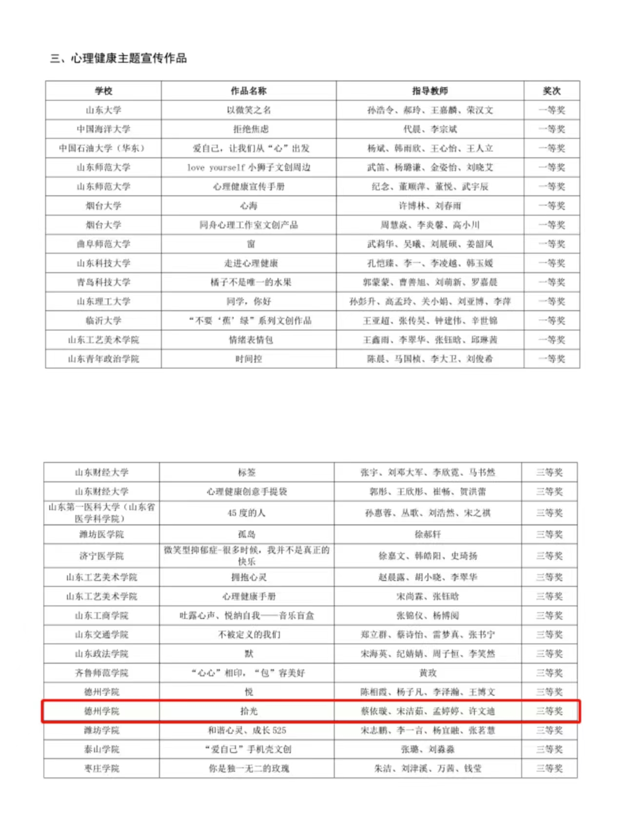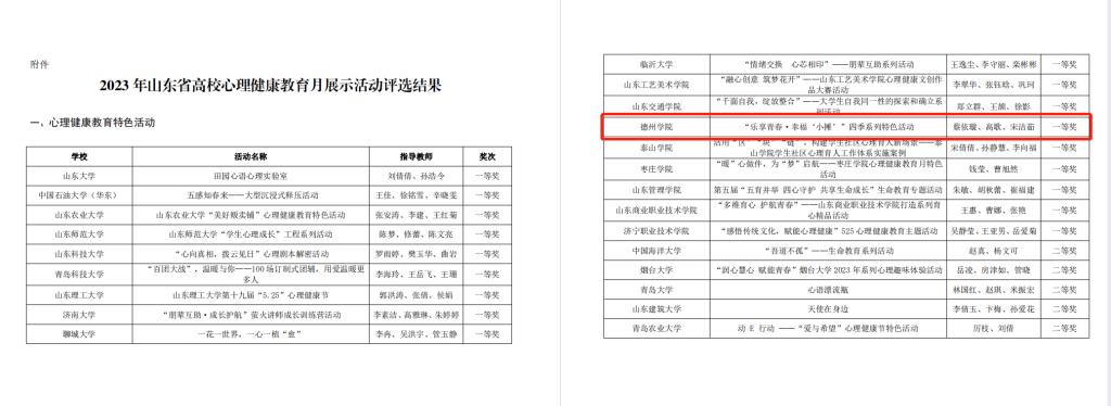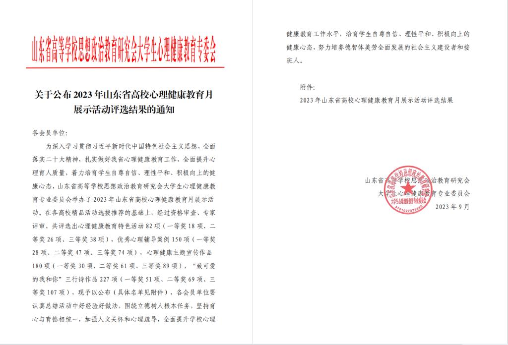 日前,山东省大学生心理健康教育专业委员会公布了2023年山东省高校心理健康教育月展示活动评选结果,经学校推荐选送,学院报送的《“乐享青春·幸福‘小摊’”四季系列特色活动》获评特色活动一等奖(全省共18项)、报送的心理健康教育宣传片《拾光》获评宣传作品三等奖,在山东省高校心理健康月展示活动评选中再创佳绩。