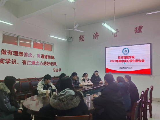 为确保集中实习成效,学院为每个单位实习生配备了校内指导教师,企业为学生配备了企业导师,以双导师制实施集中定岗实习管理。同时,为及时了解实习学生的工作开展情况,切实做好实习生实践教学日常管理和服务,建立周座谈机制,每周五组织集中实习学生分享实习经历和体会,学院领导和指导教师则根据学生实习情况指出问题,提出下一周的新要求。2023年11月24日,在明理楼0359召开了第一次集中实习学生座谈会。实习学生分享了自己实习的经历,提出了个人的困惑。学院负责人肯定了同学们第一周的实习表现,对下一阶段实习工作提出了要求,要求学生强化职场意识,以职场人的要求来对待自己,以主人翁的精神对待工作;强化学习意识,虚心向同事学习新知识,积极通过实习学习新技能,主动在实践中探求新本领,不断提升自己的业务能力和水平;强化成果意识,学会收集、整理和展示自己的实习成果,为将来更好就业增添砝码、奠定基础。实习指导教师就具体工作问题和困惑进行指导和解答。此外,学院还建立了集中顶岗实习周总结汇报、与实习单位周沟通等机制,以确保实习达到预期成效。