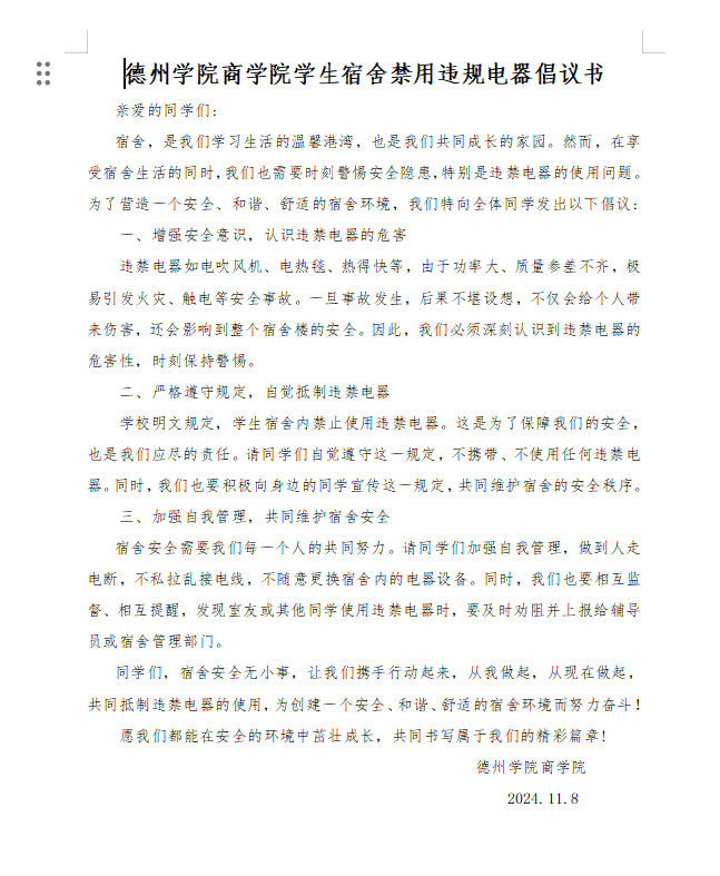 《beat365唯一官方网站学生宿舍禁用违规电器倡议书》从三方面强调宿舍安全,号召学生不仅要充分认识使用违规电器的危害,更要自觉抵制违规电器。最后,倡议书强调广大同学不仅要加强自我管理,还要勇于监督、提醒身边的同学,共同维护宿舍安全。
