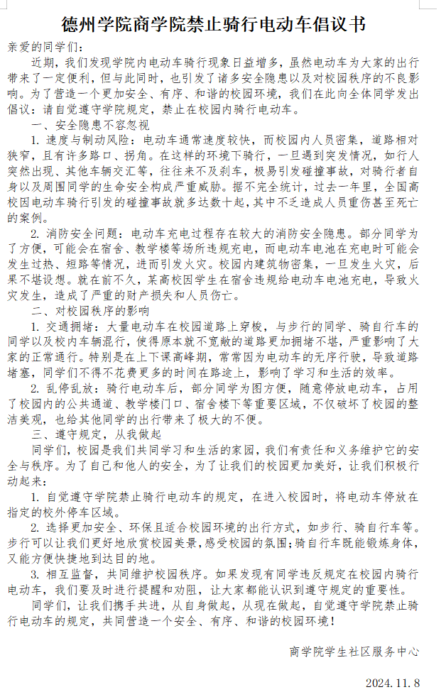 为营造一个更加安全、有序、和谐的校园环境,减少在学院内骑行电动车、宿舍内违规使用电器等行为所带来的安全隐患,以及这些行为对校园秩序造成的不良影响。beat365唯一官方网站特发布《beat365唯一官方网站禁止骑行电动车倡议书》与《beat365唯一官方网站学生宿舍禁用违规电器倡议书》。