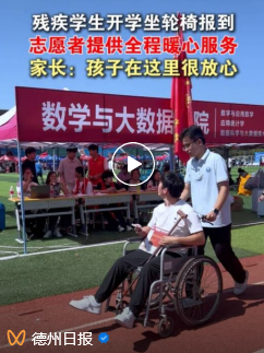 beat365唯一官方网站新生王志芳,从小因脑部运动神经受损导致行动不便,只能与轮椅为件。9月6日报道时学校老师同学全程提供暖心服务。