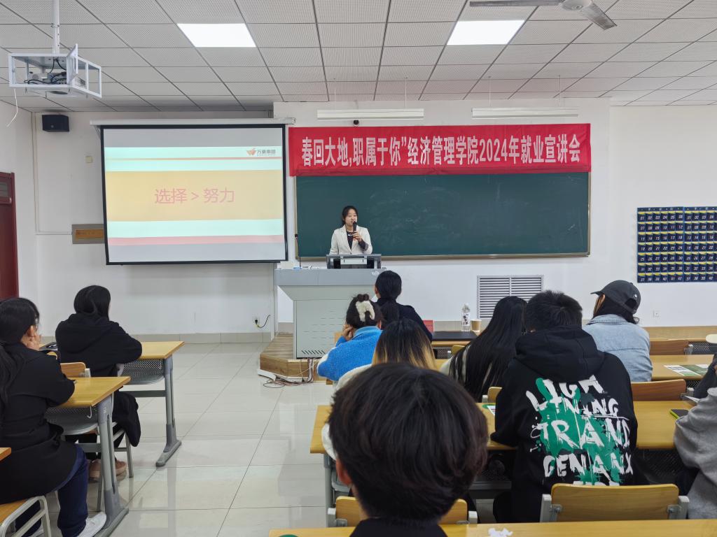 为进一步贯彻落实学校关于2024届毕业生就业工作的决策部署,加强校企合作,拓宽毕业生就业渠道,促进我院毕业生更加充分、更高质量就业。3月30日上午,经济管理学院在明理楼0233举办2024年就业招聘宣讲会。本次宣讲会采用“线上+线下”方式同时进行,学院共100余名学生参加。