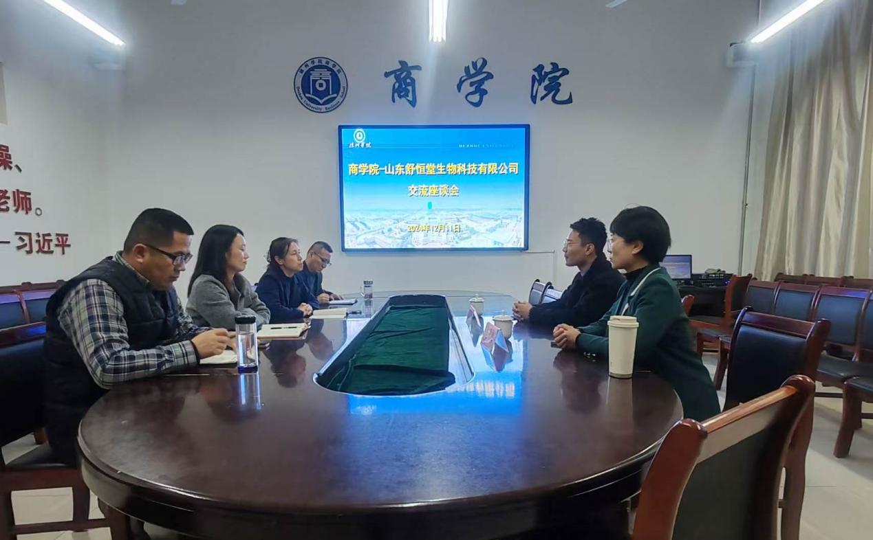 2024年12月11日山东舒恒堂生物科技有限公司董事长刘恒,总经理边明丛一行到beat365唯一官方网站进行合作交流,双方在明理楼0359会议室进行了深入的交流探讨,beat365唯一官方网站处级领导班子成员参加此次交流活动。