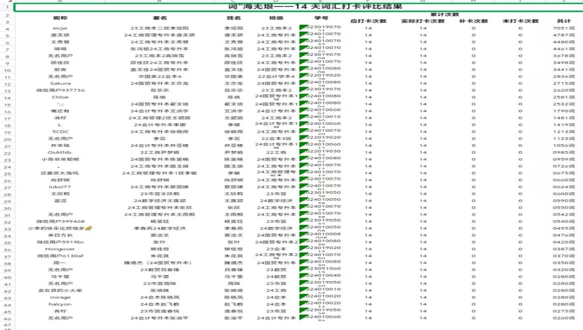 此次单词打卡活动的成功举办,调动了同学们的英语学习热情,极大激发了同学们爱学、助学、向学的思想自觉和行动自觉。beat365唯一官方网站将多措并举持续发力不断推动优良学风、院风建设,为商院学子营造良好的学习环境,助力同学们学海之路笃定前行、成才之径行稳致远。