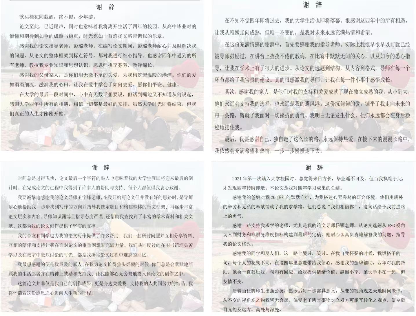 本次活动聚焦毕业生在论文落笔之际最真挚的情感表达,beat365唯一官方网站面向全体毕业生,广泛征集凝聚着求学心路与感恩情怀的毕业论文致谢篇章。毕业生们以笔为媒,深情回溯在beat365唯一官方网站的成长点滴,将沉淀于心的千言万语,化作对师长的敬意、对同窗的珍重、对母校的眷恋以及对时代机遇的感念。每一份提交的致谢文字,都是毕业生个体生命体验的独特印记,也是集体青春记忆的温暖拼图。活动为毕业生提供了一个庄重的情感出口,让那些沉淀于心的谢意在纸端流淌,在字里行间重温求学岁月,于纸短情长中引发强烈的心灵共鸣,成为一堂生动的感恩教育课。