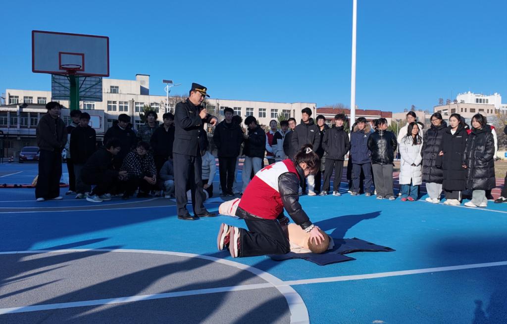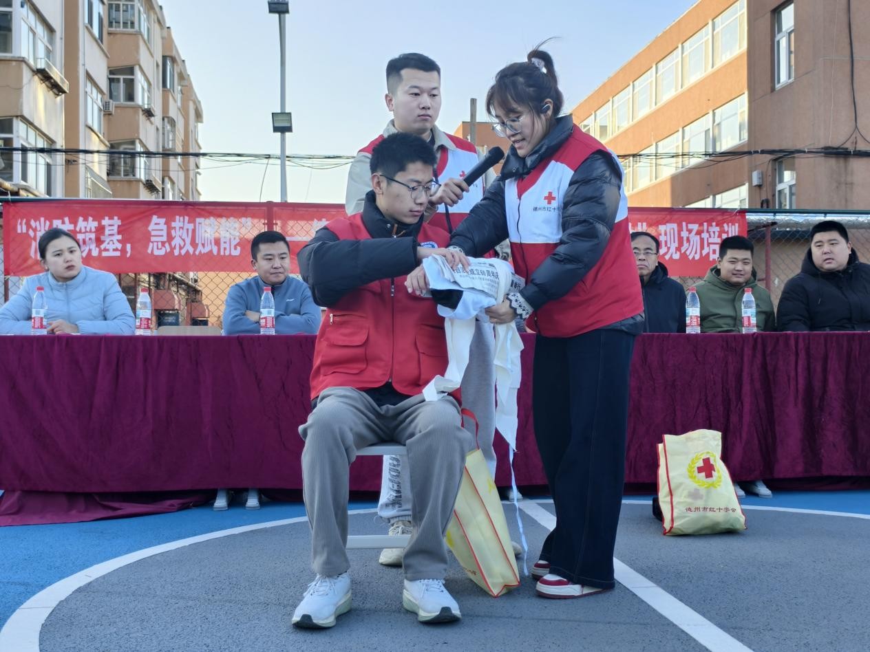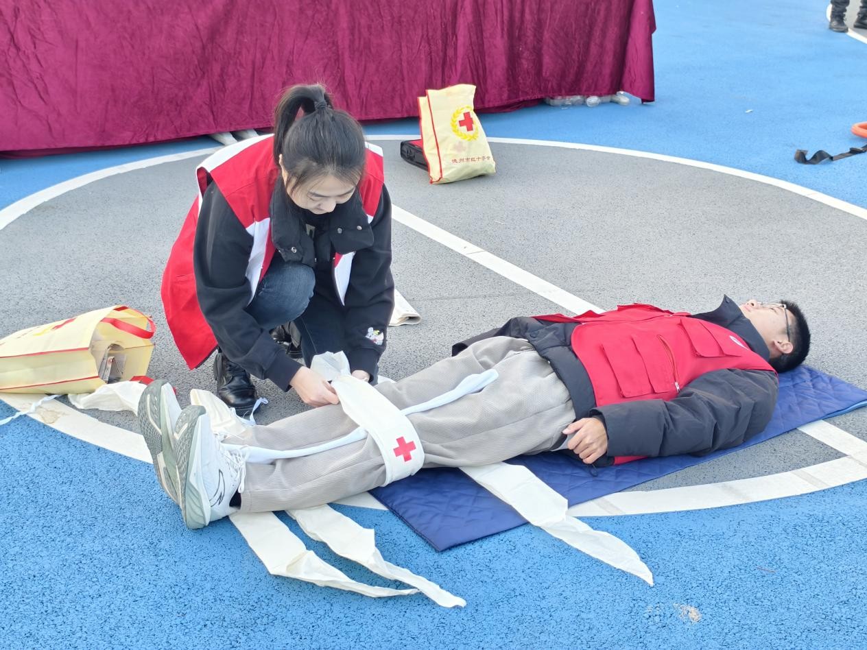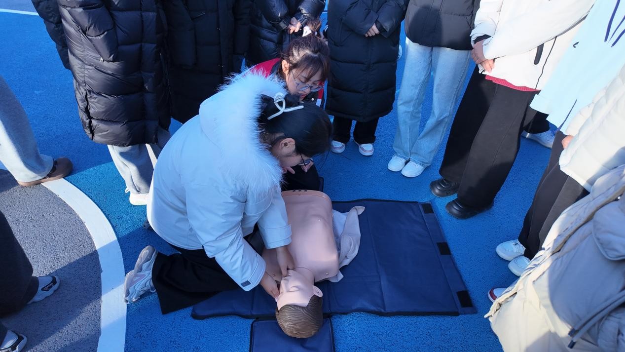 三是实操培训抓规范,急救技能强保障。活动特邀德州市红十字会应急救护培训中心国家级应急救护培训师、德州市蓝天救援队队长杨岸瑛老师主讲,开展“消防应急急救”专项培训,重点聚焦心肺复苏(CPR)、烫伤应急处理、骨折包扎固定、伤员安全运输等急救技能教学。参训学生分组进行实操训练,德州市红十字会工作人员全程指导,逐一纠正不规范动作,确保参训学生均能掌握实操要领。此次专项培训有效提升了师生应急急救实操水平,为校园安全增添重要保障。