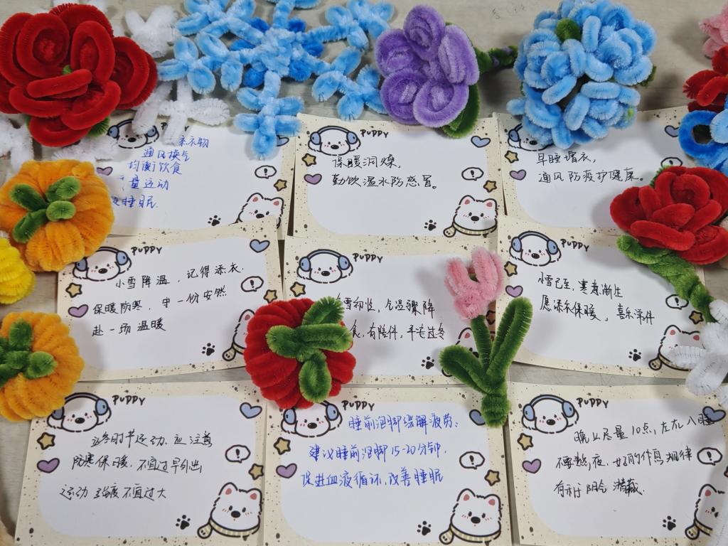 活动期间,学生们有序领取卡片、扭扭棒等手工材料,充分发挥想象力,运用剪、绕、粘等方法将扭扭棒制作成各具特色的冬日主题手工作品。同时,大家围绕小雪节气的民俗内涵与冬季养生知识进行交流,分享各自的养生小窍门,在动手实践与互动探讨中,深入了解顺应时节的健康生活方式,增强养生意识。