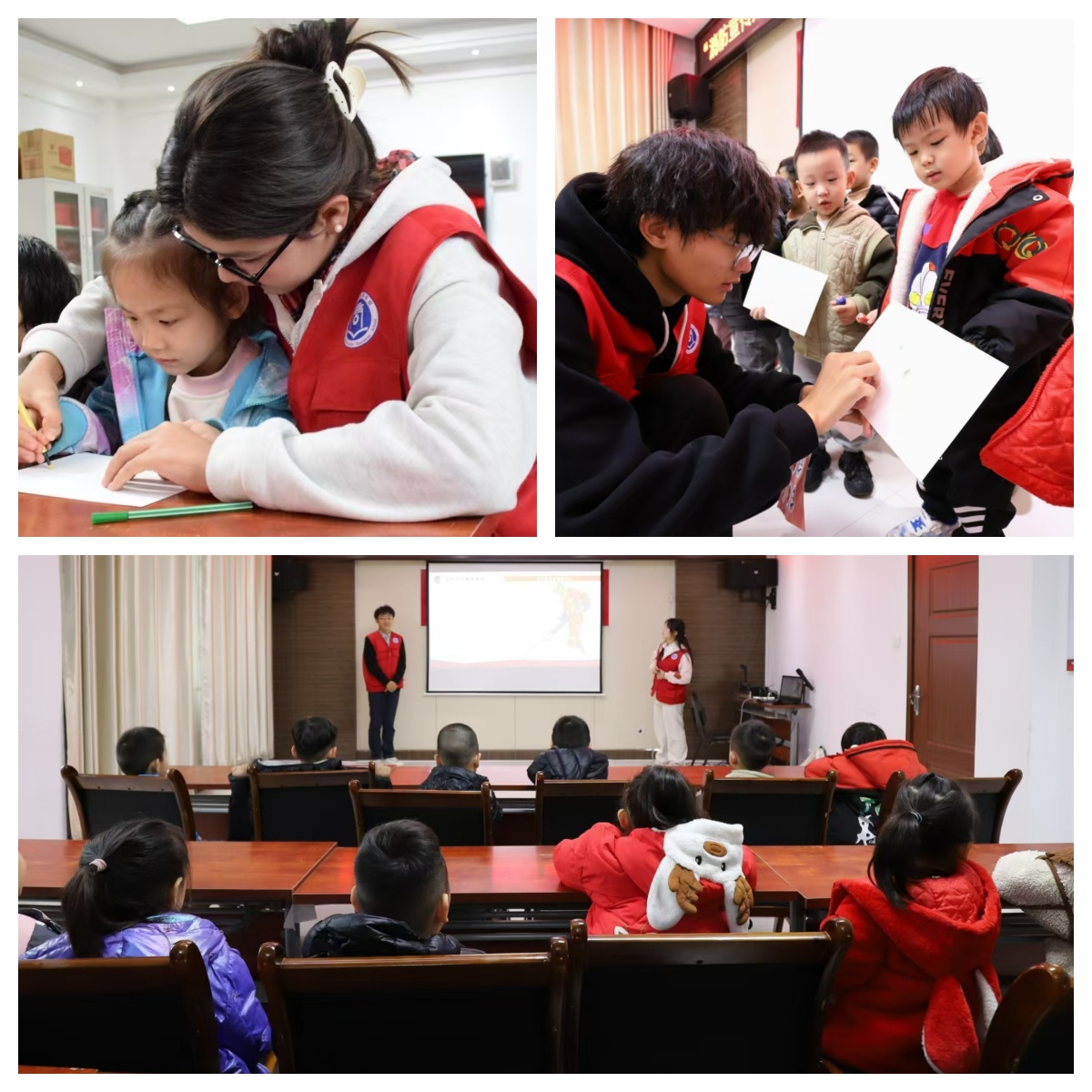 活动伊始,志愿者通过精心制作的消防宣传PPT,以理论知识和动画短片结合的形式,将消防融入生动的小故事,向儿童们讲解警惕火灾隐患、掌握自救自护技能等消防知识。随后,志愿者组织消防知识抢答,以互动形式增加了活动的趣味性,更是调动了小朋友们的课堂参与感。最后,团队成员与小朋友们携手共绘消防主题画,将所学的消防理论知识变成了一幅幅生动有趣的图画。这些绘画作品色彩斑斓,充满童真,传递着消防安全的重要意义,在小朋友心中种下了消防安全的种子。